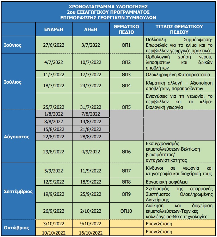 Tη Δευτέρα 27 Ιουνίου 2022 θα ξεκινήσει η υλοποίηση του 2ου εισαγωγικού προγράμματος επιμόρφωσης των Γεωργικών Συμβούλων για την εγγραφή τους στο σχετικό Μητρώο το με την ανάρτηση του πρώτου θεματικού πεδίου, με τίτλο: «Πολλαπλή Συμμόρφωση – Επωφελείς για το κλίμα και το περιβάλλον γεωργικές πρακτικές».