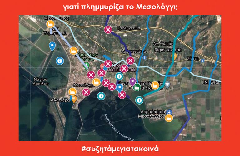 Ο Μη κερδοσκοπικός οργανισμός ΤΟ ΜΕΣΟΛΟΓΓΙ ΤΩΝ ΝΤΟΠΙΩΝ-MESSOLONGHI BY LOCALS στο πλαίσιο της δράσης του «Συζητάμε για τα κοινά» και συγκεκριμένα για την δημόσια συζήτηση που έχει ανοίξει για το ζήτημα των πλημμυρών στο Μεσολόγγι, δημιούργησε έναν διαδραστικό χάρτη που ανανεώνεται συνεχώς και στόχο έχει να αναδείξει τις αιτίες που πλημμυρίζει το Μεσολόγγι.