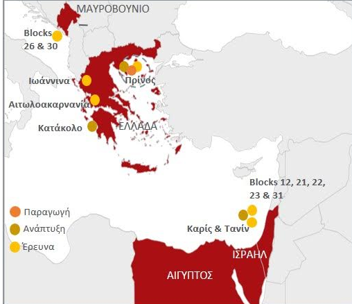 Η προηγούμενη χρονιά έκλεισε με μέση ημερήσια παραγωγή στις 4.053 βαρέλια από τα κοιτάσματα του Πρίνου και του Βόρειου Πρίνου, ενώ ο προγραμματισμός για το 2019 προβλέπει την εκτέλεση συνολικά έξι γεωτρήσεων στο Ισραήλ και στην Ελλάδα.