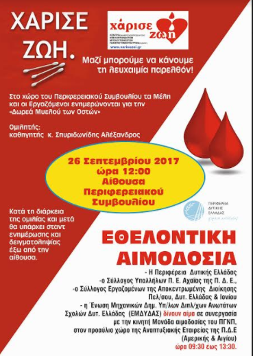 Η Περιφέρεια Δυτικής Ελλάδος σε συνεργασία με το ΚΕ.Δ.Μ.Ο.Π. «Χάρισε ζωή» και τους συλλόγους εργαζομένων: Σύλλογο Υπαλλήλων Περιφερειακής Ενότητας Αχαΐας της Περιφέρειας Δυτικής Ελλάδας, Σύλλογο Εργαζομένων στην Αποκεντρωμένη Διοίκηση Πελοποννήσου Δυτικής Ελλάδας και Ιονίου, Ένωση Μηχανικών Δημοσίων Υπαλλήλων Διπλωματούχων Ανωτάτων Σχολών Δυτικής Ελλάδας (ΕΜΔΥΔΑΣ) πρόκειται να οργανώσουν μία κοινή δράση που στοχεύει στην ενημέρωση, ευαισθητοποίηση και προσέλκυση εθελοντών μυελού των οστών και εθελοντών αιμοδοτών.