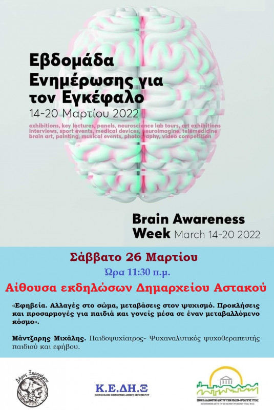 Στο πλαίσιο της «Εβδομάδας Ενημέρωσης για τον εγκέφαλο» (Brain Awareness Week), διοργανώνεται το Σάββατο 26 Μαρτίου, στις 11:30 π.μ. στην Αίθουσα εκδηλώσεων του Δημαρχείου Αστακού, ενημέρωτική εκδήλωση με θέμα: «Εφηβεία – Αλλαγές στο σώμα, μεταβάσεις στον ψυχισμό. Προκλήσεις και προσαρμογές για παιδιά και γονείς μέσα σε έναν μεταβαλλόμενο κόσμο».