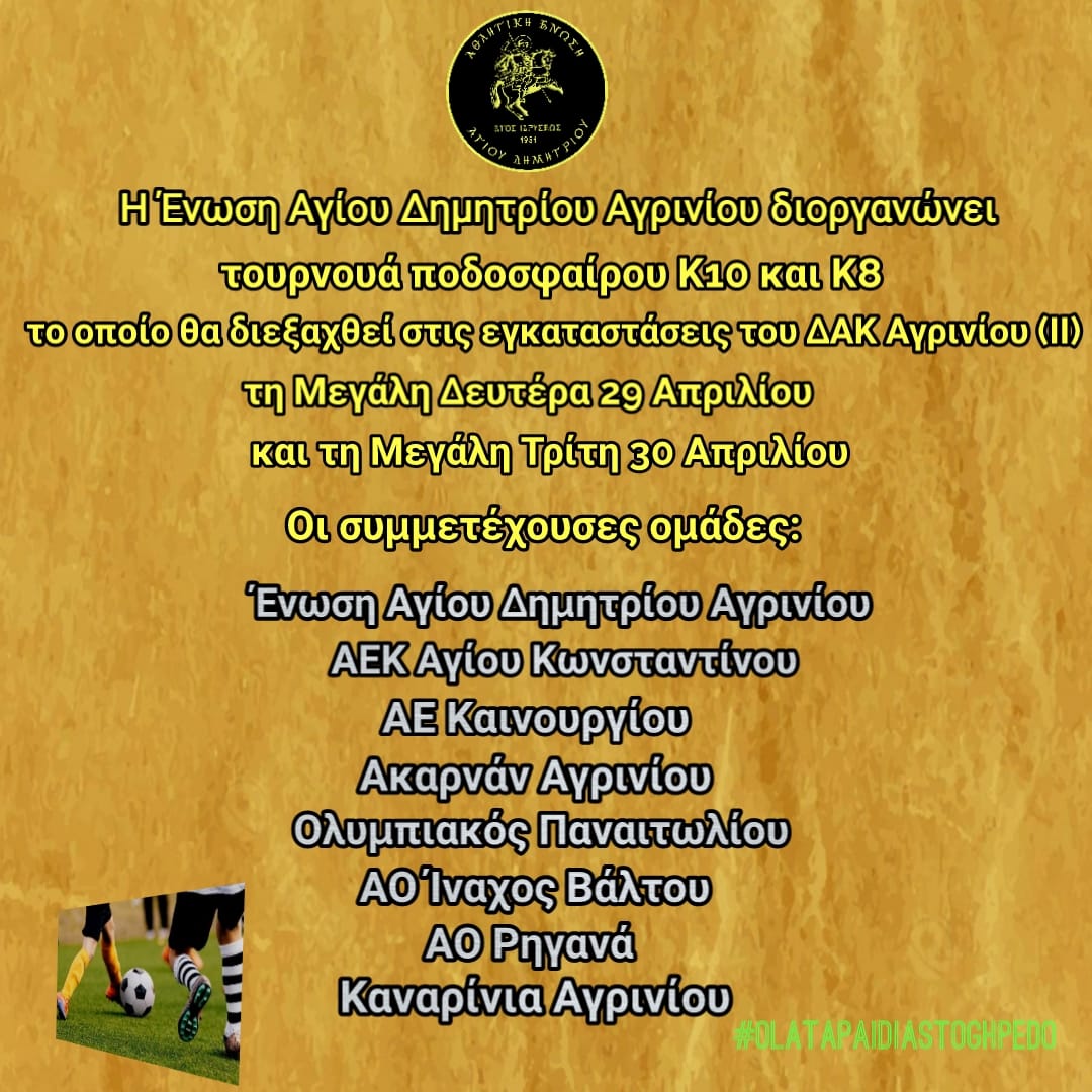 Η Ένωση Αγίου Δημητρίου Αγρινίου που τα τελευταία χρόνια έχει ρίξει ειδικό βάρος στα Τμήματα Υποδομής της, με σύνθημα «όλα τα παιδιά στο Γήπεδο», διοργανώνει τη Μεγάλη Δευτέρα, 29 Απριλίου και τη Μεγάλη Τρίτη 30 Απριλίου, Τουρνουά Ποδοσφαίρου για ομάδες Κ8 και Κ10 ετών.