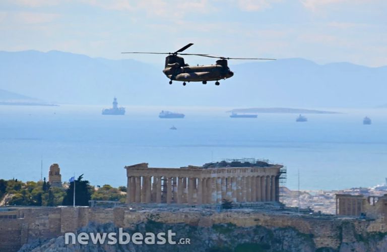 Αεροσκάφη της Πολεμικής Αεροπορίας καθώς και ελικόπτερα Σινούκ πέταξαν σήμερα, περίπου στη μία το μεσημέρι, στον ουρανό της Αττικής στο πλαίσιο των δοκιμαστικών για την παρέλαση της 25ης Μαρτίου.
