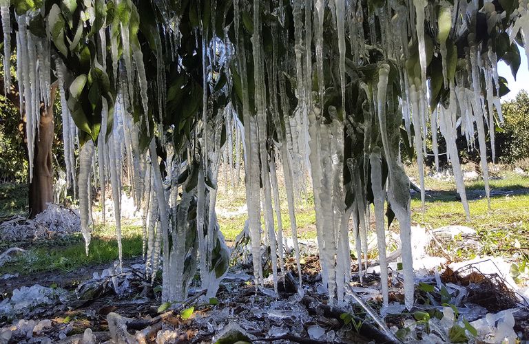Εντυπωσιακές είναι οι εικόνες με τους παγωμένους κρυστάλλους σε πολλά περιβόλια στον Καλυβιώτικο κάμπο, αφού η θερμοκρασία χθες τη νύχτα αλλά και τις πρώτες πρωινές ώρες έφτασε τους -4 βαθμούς Κελσίου με αποτέλεσμα να «παγώσουν» τα δέντρα και να γεμίσουν σταλακτίτες!
