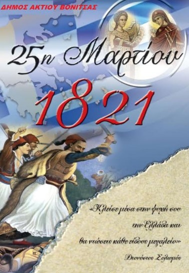 Ο Δήμαρχος του Δήμου Ακτίου Βόνιτσας κ. Γεώργιος Αποστολάκης, το Δ.Σ. του Δήμου Ακτίου Βόνιτσας και το Κέντρο Κοινωνικής Μέριμνας και Ανάπτυξης Δήμου Ακτίου Βόνιτσας, σας προσκαλούν στις εκδηλώσεις για τον εορτασμό της Εθνικής Επετείου της 25ης Μαρτίου 1821.