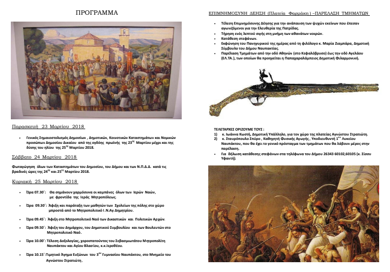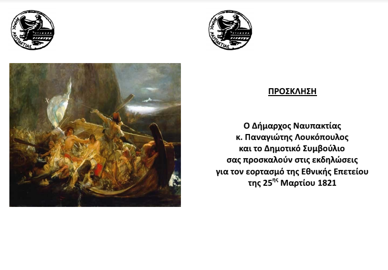 Ο Δήμαρχος Ναυπακτίας κ. Παναγιώτης Λουκόπουλος και το Δημοτικό Συμβούλιο σας προσκαλούν στις εκδηλώσεις για τον εορτασμό της Εθνικής Επετείου της 25ης Μαρτίου 1821