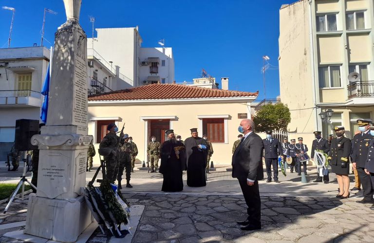 Μετά την Δοξολογία που τελέσθηκε στον Μητροπολιτικό Ναό Αγίου Σπυρίδωνος, ακολούθησε κατάθεση στεφάνων στο Ηρώο Πεσόντων Τελευταίων Πολέμων (Τρίγωνο).
