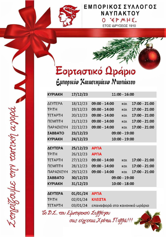 Το Δ.Σ. του Εμπορικού Συλλόγου Ναυπάκτου ανακοινώνει το Εορταστικό ωράριο των Εμπορικών καταστημάτων για τη περίοδο των Χριστουγέννων.