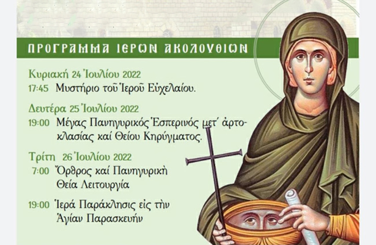 19:00 Ιερά Παράκλησις εις την Αγία Παρασκευή.