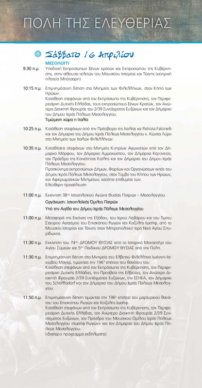 10.25 π.μ. Κατάθεση στεφάνων από την Πρέσβειρα της Ιταλίας κα.Patrizia Falcinelli και τον Δήμαρχο του Δήμου Ιεράς Πόλης Μεσολογγίου κ. Κώστα Λύρο στο Μνημείο των Ιταλών Φιλελλήνων