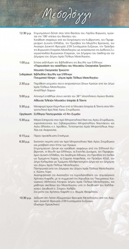 9.30 π.μ. Υποδοχή Εκπροσώπων Ξένων κρατών και Εκπροσώπου της Κυβέρνησης στην αίθουσα τελετών του Μουσείου Ιστορίας και Τέχνης (κεντρική Πλατεία Μπότσαρη)10.15 π.μ. Επιμνημόσυνη δέηση στο Μνημείο των Φιλελλήνων στον Κήπο των Ηρώων
