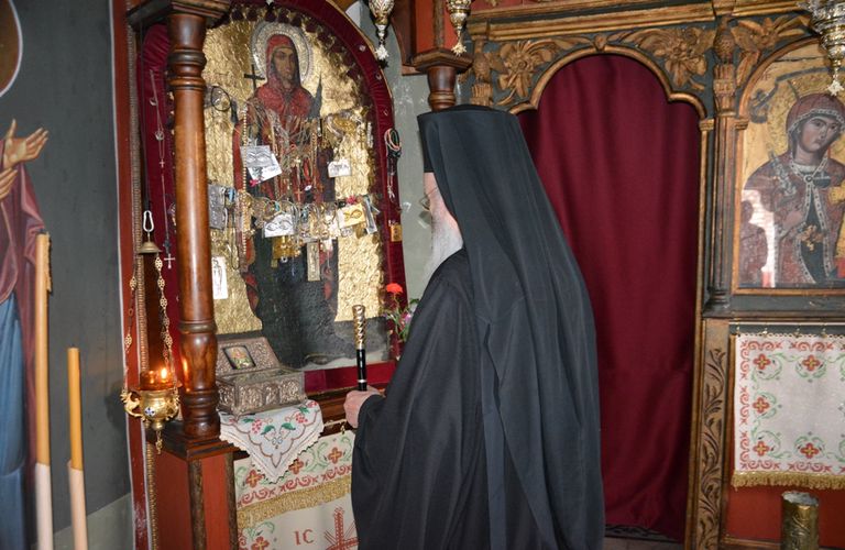 Στη συνέχεια ο Σεβασμιώτατος Τοποτηρητής επισκέφθηκε την Ιερά Μονή Αγίας Παρασκευής Μάνδρας, προσκύνησε την θαυματουργό εικόνα της Αγίας και ξεναγήθηκε στους χώρους της Μονής.