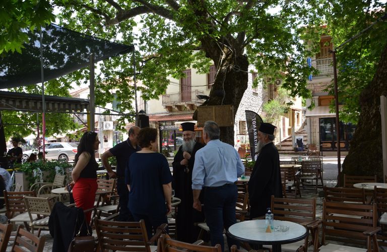 Κατόπιν έκανε στάση στην κεντρική πλατεία του Θέρμου, επισκέφθηκε όλα τα καταστήματα και συνομίλησε με τους ευρισκομένους εκεί κατοίκους του Θέρμου και τους επισκέπτες.