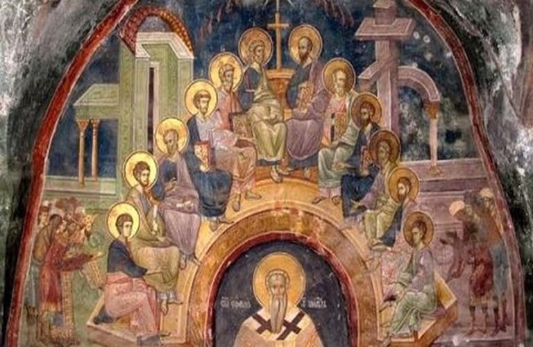 Μεγάλα είναι και ξεπερνούν την ανθρώπινη λογική τα χαρίσματα που μάς δώρισε σήμερα ο φιλάνθρωπος Θεός. Γι’ αυτό ας χαρούμε όλοι μαζί και σκιρτώντας από αγαλλίαση ας ανυμνήσουμε τον Κύριό μας. Γιατί η σημερινή ημέρα είναι για μάς εορτή και πανηγύρι.Όπως δηλαδή διαδέχονται η μια την άλλη οι εποχές και οι κινήσεις του ήλιου, έτσι ακριβώς και στην Εκκλησία η μία εορτή διαδέχεται την άλλη και με τον τρόπο αυτό απ’ τη μια πηγαίνουμε στην άλλη. Πριν από λίγο καιρό εορτάσαμε τον σταυρό, το πάθος και την Ανάσταση, και ύστερα από αυτά την Ανάληψη του Κυρίου μας Ιησού Χριστού στους ουρανούς. Σήμερα φθάσαμε στην κορυφή των αγαθών, σ’ αυτήν την κορωνίδα των εορτών, βρισκόμαστε πια στην πραγματοποίηση των επαγγελιών του Κυρίου. «Γιατί αν φύγω –λέει- θα σάς στείλω άλλον Παράκλητο, και δεν θα σάς αφήσω ορφανούς». (Ιωάν. 16,6). Βλέπετε το πατρικό Του ενδιαφέρον; Βλέπετε την ανέκφραστη φιλανθρωπία Του; Πριν λίγες ημέρες ανελήφθη στον ουρανό, κάθισε στον βασιλικό θρόνο, στα δεξιά του Πατρός, και σήμερα μάς στέλνει ως δώρο τα χαρίσματα του Αγίου Πνεύματος και μ’ αυτόν τον τρόπο μάς χορηγεί άπειρα ουράνια αγαθά. Γιατί, πες μου, ποιο από τα αγαθά που συμβάλλουν στη σωτηρία μας δεν μάς δόθηκε από το Άγιο Πνεύμα;
