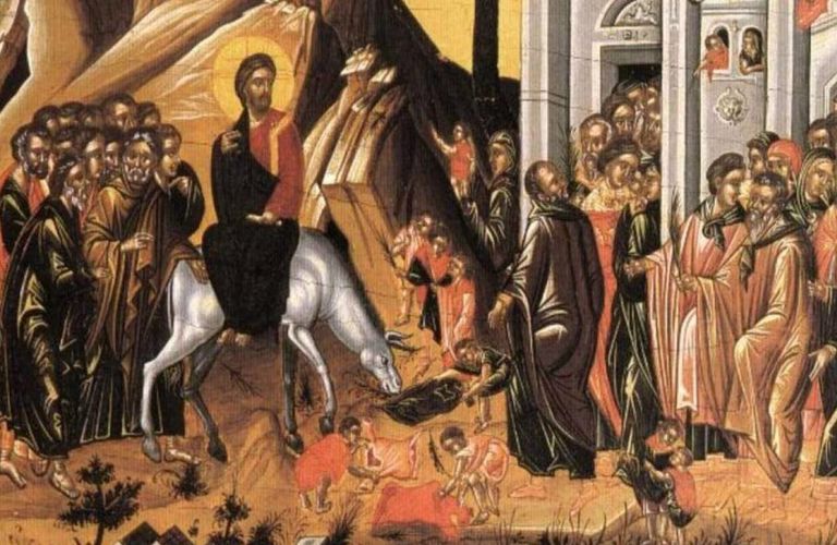 Ο Χριστός εισέρχεται στα Ιεροσόλυμα «επί πώλον όνου». Πορεύεται και οι Ισραηλίτες τον υποδέχονται με τιμές ως Βασιλιά. Εκείνος δεν δίνει ιδιαίτερη σημασία στις τιμές, δεν περιορίζεται στο πανηγύρι, στην πρόσκαιρη δόξα, αλλά προχωρεί στο σταυρό και την Ανάσταση.
