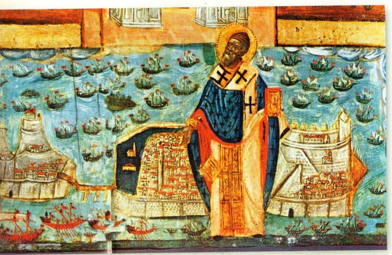 Ὡς τῶν ὁρθοδόξων ὑπέρμαχος, καὶ πάντων τῶν ἀπίστων ἀντίπαλον, παμμακάριστε Σπυρίδων ὑμνοῦμέν σε, καὶ δυσωποῦμέν σε, φυλάττειν τὴν πόλιν σου, πάσης ὁρμῆς βαρβάρων ἀμέτοχον.