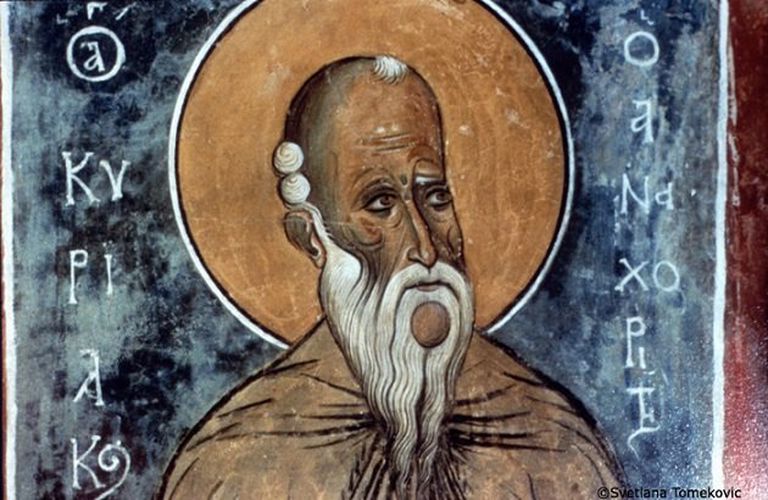 Χριστῷ ἠκολούθησας, καταλιπῶν τὰ τῆς γῆς, καὶ βίον ἰσάγγελον, ἐπολιτεύσω σαφῶς, ὡς ἄσαρκος Ὅσιε, σὺ γὰρ ἐν ταὶς ἐρήμοις, προσχωρῶν θείω πόθω, σκίλλη πίκρα τὴν πάλαι, πικρᾶν γεῦσιν ἀπώσω. Διὸ Κυριακὲ θεοφόρε, ἀξίως δεδόξασαι.