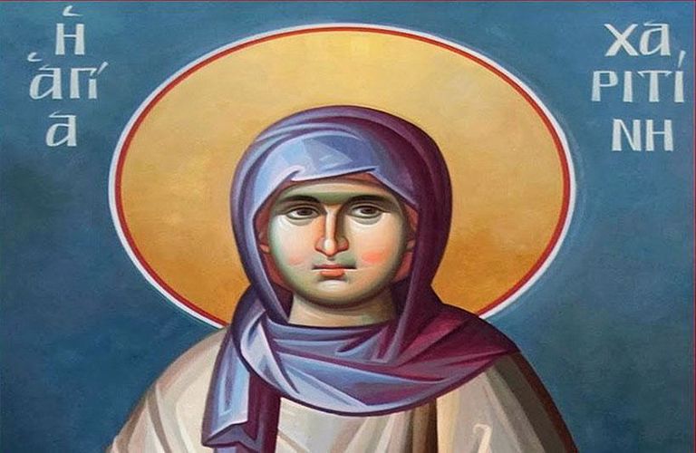 Θεία χάριτι, κραταιωθεῖσα, κράτος ἤσχυνας, τῆς δυσσεβείας, Χαριτίνη ὑπὲρ φύσιν ἀθλήσασα ὅθεν χαρίτων πηγὴν ἀδαπάνητον, ὡς γλυκασμὸν ἀναβλύζεις τοὶς κράζουσι. Μάρτυς ἔνδοξε, Χριστὸν τὸν θεὸν ἱκέτευε, δωρήσασθαι ἠμὶν τὸ μέγα ἔλεος.