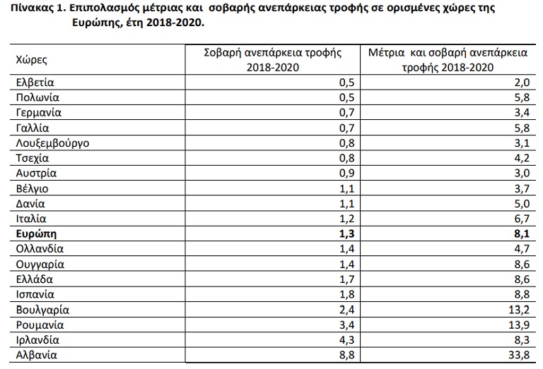 Στον Πίνακα 1 παρουσιάζεται ο επιπολασμός μέτριας και σοβαρής ανεπάρκειας τροφής του συνολικού πληθυσμού, με βάση την κλίμακα ανεπάρκειας τροφής (Food Insecurity Experience Scale – FIES) σε ορισμένες χώρες της Ευρώπης για τα έτη 2018-2020.