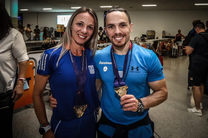 Με τα χρυσά μετάλλια κρεμασμένα στο στήθος εμφανίστηκαν στην αίθουσα των αφίξεων του «Ελευθέριος Βενιζέλος», η Αντιγόνη Ντρισμπιώτη και ο Λευτέρης Πετρούνιας, αρτιαφιχθέντες από το Μόναχο.