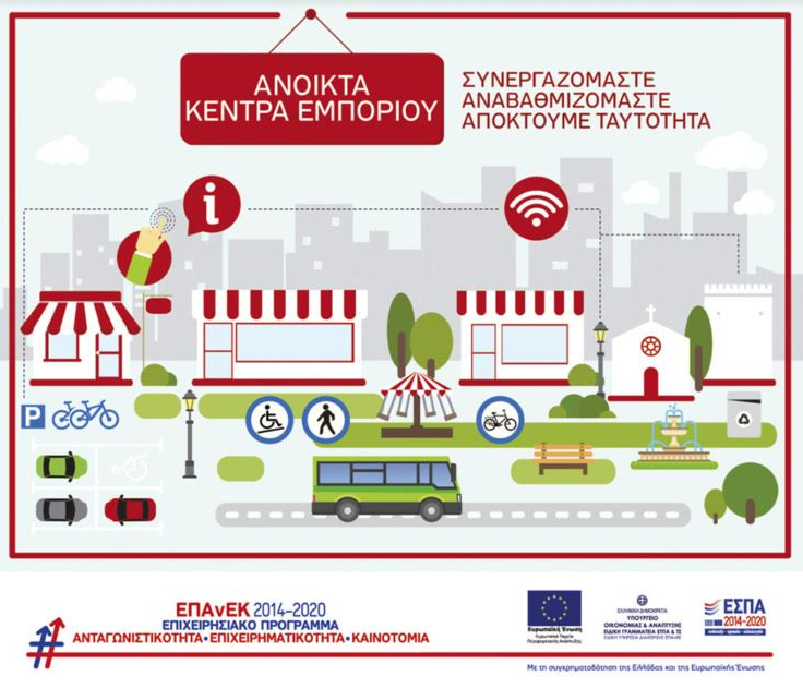 Στο πλαίσιο της δράσης «Ανοικτά Κέντρα Εμπορίου» επιδιώκεται η ενίσχυση και τόνωση της οικονομικής δραστηριότητας που αναπτύσσεται σε εμπορικές περιοχές και ειδικότερα σε περιοχές που διαθέτουν σημαντικούς τουριστικούς και πολιτιστικούς πόρους. Για την επίτευξη του στόχου αυτού, οι Συνεργαζόμενοι Φορείς δεσμεύονται ότι θα υλοποιήσουν ένα σύνολο συνεκτικών και αλληλένδετων έργων που α) θα αναβαθμίσει τη λειτουργικότητα και αισθητική του δημόσιου χώρου και β) θα οργανώσει τον δημόσιο χώρο και την οικονομική δραστηριότητα με υιοθέτηση και χρήση εφαρμογών έξυπνης πόλης (smart city).