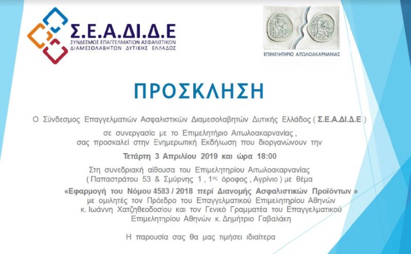 Επιμελητήριο Αιτωλοακαρνανίας: Ενημερωτική εκδήλωση με θέμα την Εφαρμογή του Ν.4583/2018 περί διανομής ασφαλιστικών προϊόντων στις 03 Απριλίου και ώρα 18:00 στην συνεδριακή αίθουσα του Επιμελητηρίου Αιτωλοακαρνανίας.