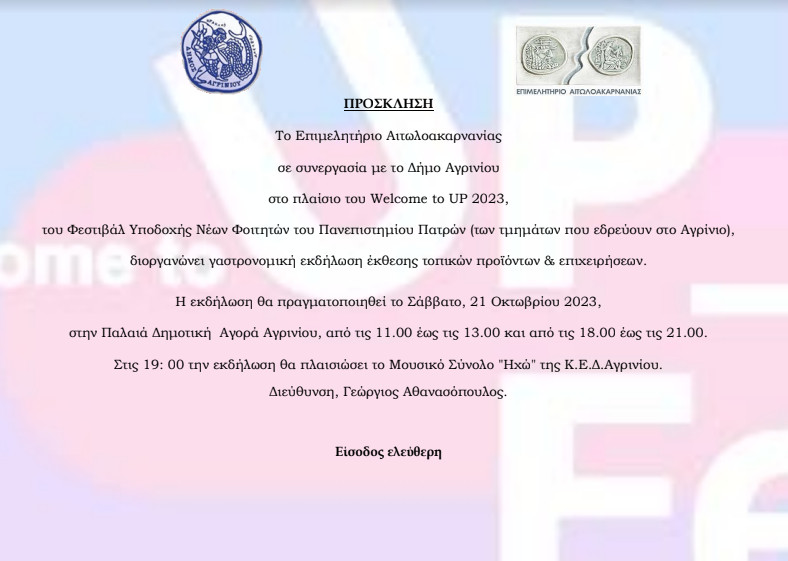 Το Επιμελητήριο Αιτωλοακαρνανίας σε συνεργασία με τoν Δήμο Αγρινίου στο πλαίσιο του «Welcome to UP 2023», του Φεστιβάλ Υποδοχής Νέων Φοιτητών του Πανεπιστημίου Πατρών (των Τμημάτων που εδρεύουν στο Αγρίνιο), διοργανώνει γαστρονομική εκδήλωση έκθεσης τοπικών προϊόντων & επιχειρήσεων.