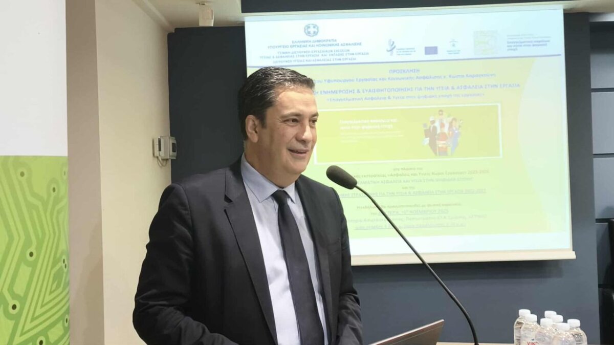 Ακολούθως, ο Δρ. Ιωάννης Κωνσταντακόπουλος, Μηχανολόγος Μεταλλειολόγος Μηχανικός Ε.Μ.Π. από το Τμήμα Εθνικού Εστιακού Πόλου και Πολιτικής Προαγωγής της Υ.Α.Ε., μίλησε για το μέλλον της εργασίας σε ένα ψηφιακό περιβάλλον και την επαγγελματική ασφάλεια και υγεία και παρουσίασε βασικά στοιχεία της Ευρωπαϊκής Εκστρατείας που πραγματοποιήθηκε μεταξύ του 2023 και του 2025, παρουσιάζοντας παράλληλα τις προκλήσεις και τις ευκαιρίες που δημιουργεί η τεχνολογική εξέλιξη στον χώρο εργασίας.