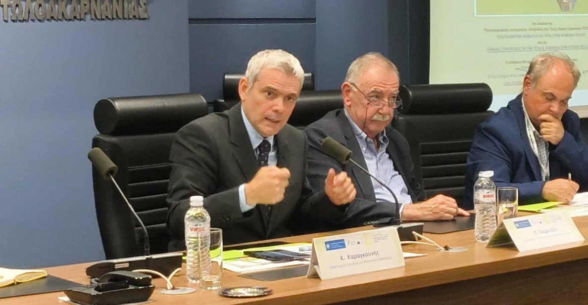 Στο πρώτο μέρος των ομιλιών, ο Χημικός Ηλίας Γαζής, από το Τμήμα Εποπτείας Φορέων Παροχής Υπηρεσιών για την Υ.Α.Ε. της Διεύθυνσης Υγείας και Ασφάλειας στην Εργασία του ΥΠ.Ε.Κ.Α., παρουσίασε το θεσμικό πλαίσιο για την ασφάλεια και την υγεία στην εργασία, αναδεικνύοντας τις βασικές παραμέτρους που καθορίζουν τη σύγχρονη πολιτική πρόληψης επαγγελματικών κινδύνων.
