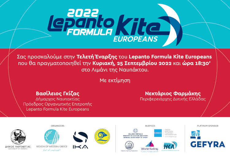 Το 2022 Lepanto Formula Kite Europeans που πραγματοποιείται σε συνδιοργάνωση του Δήμου Ναυπακτίας, της Περιφέρειας Δυτικής Ελλλάδας, της ΙΚΑ (International Kiteboarding Association) και του Ιστιοπλοϊκού Ομίλου Ρίου ΙΑΣΩΝ, διεξάγεται σε συνεργασία με τον Ναυτικό Όμιλο Ναυπάκτου και με την υποστήριξη του Δημοτικού Λιμενικού Ταμείου Ναυπακτίας.