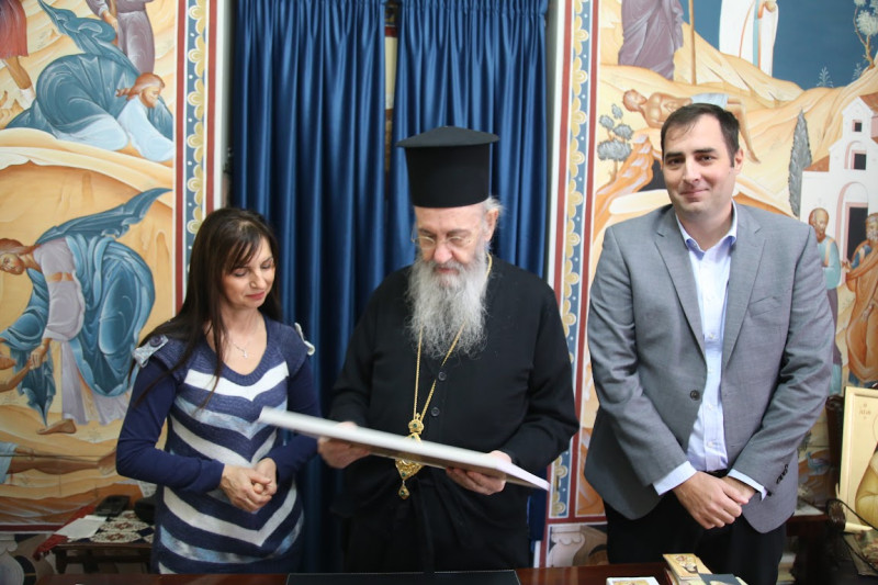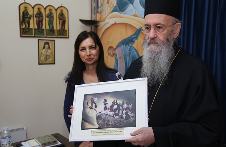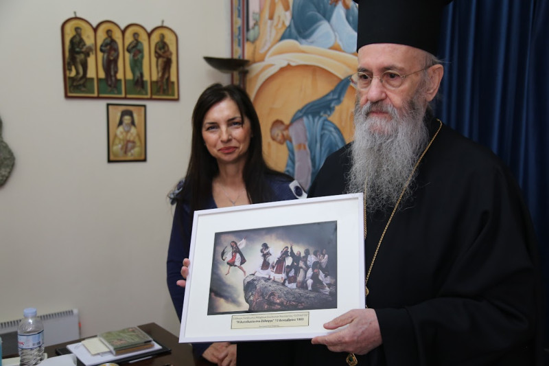 Ὁ Σεβασμιώτατος ἐξέφρασε στήν Πρόεδρο τοῦ Συλλόγου κ. Μαρία Σαγώνα τήν χαρά καί τόν θαυμασμό του γιά τήν σκηνοθετική ἀναπαράσταση τοῦ χοροῦ τοῦ Ζαλόγγου στήν φωτογραφία πού τοῦ προσέφεραν, ἡ ὁποία θά τοποθετηθῆ στά Γραφεῖα τῆς Ἱερᾶς Μητροπόλεως.