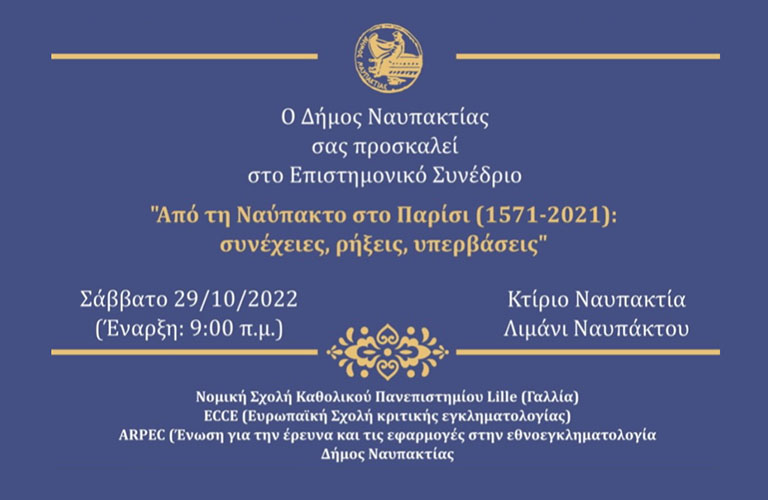 Ο Δήμος Ναυπακτίας σε συνεργασία με τη Νομική Σχολή Καθολικού Πανεπιστημίου Lille (Γαλλία), την Ευρωπαϊκή Σχολή κριτικής εγκληματολογίας (ECCE), την Ένωση για την έρευνα και τις εφαρμογές στην εθνοεγκληματολογία (ARPEC) διοργανώνουν το Επιστημονικό Συνέδριο «Από τη Ναύπακτο στο Παρίσι (1571-2021): συνέχειες, ρήξεις, υπερβάσεις» το Σάββατο, 29 Οκτωβρίου 2022, ώρα 9:00’ έως 18:00’, στο κτήριο Ναυπακτία (Λιμάνι Ναυπάκτου).