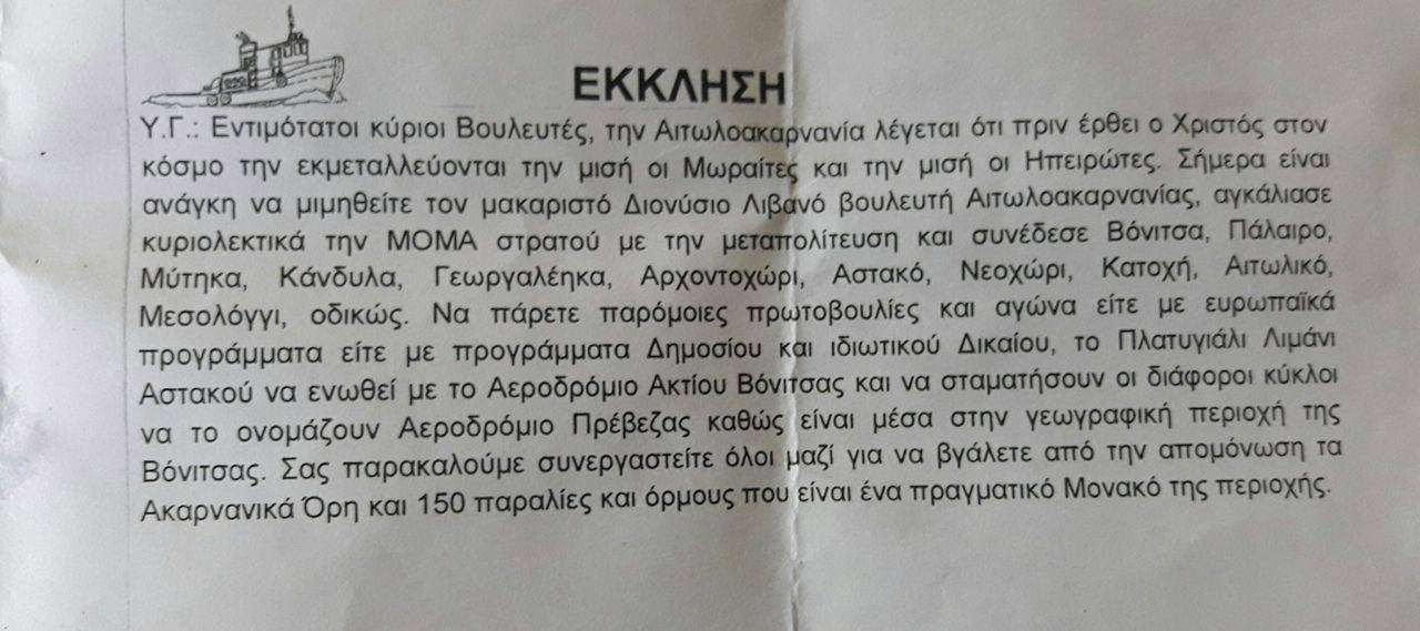 Επιστολή παλαιοημερολογίτη Μητροπολίτη για την ύδρευση Αστακού και Βόνιτσας