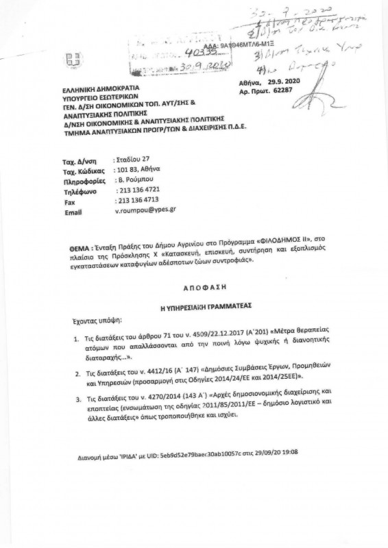 Εντάχθηκε χθες 29 Σεπτεμβρίου 2020 το έργο της κατασκευής καταφυγίου αδέσποτων ζώων συντροφιάς του Δήμου Αγρινίου, στο Πρόγραμμα «Φιλόδημος ΙΙ» συνολικού προϋπολογισμού 694.000 ευρώ.