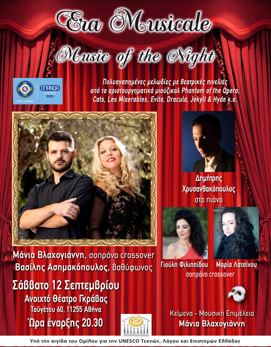 Η συναυλία φέρει τον τίτλο «Music of the Night» και πρόκειται να πραγματοποιηθεί το Σάββατο 12 Σεπτεμβρίου 2020 στις 20.30, στο Ανοιχτό Θέατρο Γκράβας (Ταϋγέτου 60, 11255 Αθήνα). Η είσοδος είναι ΕΛΕΥΘΕΡΗ για το κοινό, με δελτία εισόδου.