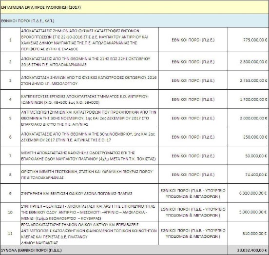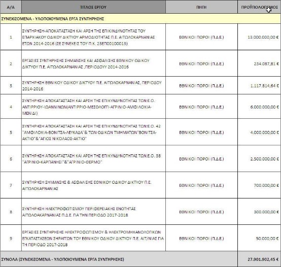 Με πολιτικούς – και όχι μικροπολιτικούς – όρους, με κανόνες πληροφόρησης – και όχι παραπληροφόρησης – παραθέτουμε πίνακες με τα έργα στην περιφερειακή Ενότητα Αιτωλοακαρνανίας, προϋπολογισμού περίπου 88.000.000 ευρώ.