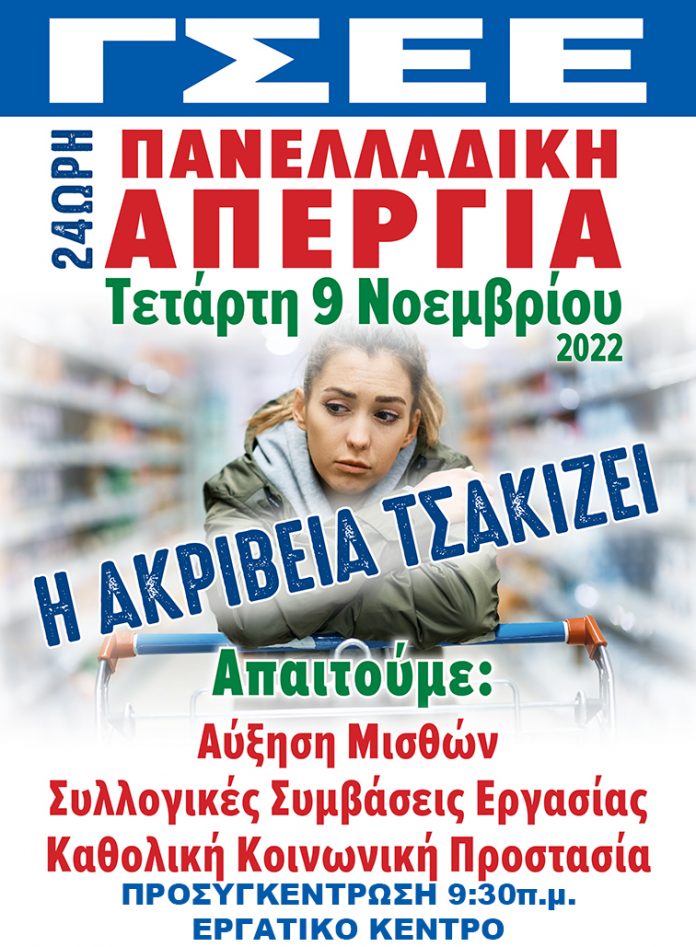 Το Εργατικό Κέντρο Ναυπακτίας & Δωρίδας, συμμετέχει στην 24ωρη Πανελλαδική Γενική Απεργία που προκήρυξε η ΓΣΕΕ την Τετάρτη 9 Νοεμβρίου 2022, και καλεί όλους τους εργαζόμενους, τους άνεργους, τους συνταξιούχους της ευρύτερης περιοχής στη συγκέντρωση διαμαρτυρίας στην κεντρική πλατεία στις 10:00 το πρωί.
