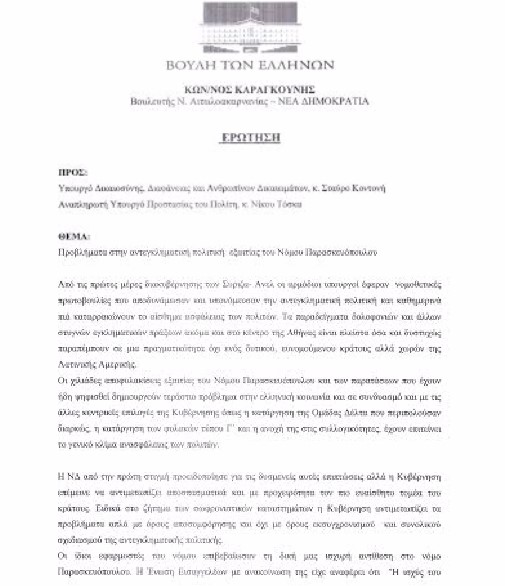 Ερώτηση Καραγκούνη για τα προβλήματα στην αντεγκληματική πολιτική εξαιτίας του Νόμου Παρασκευόπουλου