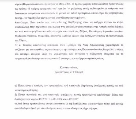 Η ΝΔ από την πρώτη στιγμή προειδοποίησε για τις δυσμενείς αυτές επιπτώσεις αλλά η Κυβέρνηση επέμεινε να αντιμετωπίζει αποσπασματικά και με προχειρότητα τον πιο ευαίσθητο τομέα του κράτους. Ειδικά στο ζήτημα των σωφρονιστικών καταστημάτων η Κυβέρνηση αντιμετωπίζει τα προβλήματα απλά με όρους αποσυμφόρησης και όχι με όρους εκσυγχρονισμού και συνολικού σχεδιασμού της αντεγκληματικής πολιτικής.