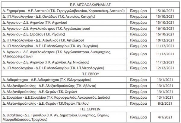 Οι οριοθετημένες περιοχές, για την επιχορήγηση αγροτικών εκμεταλλεύσεων του ν. 4797/2021 (Α’ 66), για την αντιμετώπιση ζημιών από θεομηνίες και ειδικότερα από πλημμύρες 4.1.2021 στην Π.Ε. Σερρών, πλημμύρες 11-12.1.2021 και 1.2.2021 στην Π.Ε. Έβρου, πλημμύρα 11.12.2021 στην Π.Ε. Φθιώτιδος, καθώς και πλημμύρες 15-16.10.2021 και 11-12.12.2021 στην Π.Ε. Αιτωλοακαρνανίας, όπως αναλυτικά αναφέρονται στα σχετικά φύλλα της Εφημερίδας της Κυβέρνησης και στον Πίνακα που ακολουθεί, εντάσσονται στην παρούσα απόφαση ως επιλέξιμες, για την αντιστάθμιση ζημιών φυτικού κεφαλαίου και μόνο, εφόσον υποβληθούν σχετικές αιτήσεις χορήγησης ενίσχυσης, στο πλαίσιο με της ανακοίνωσης του προγράμματος, μετά από βεβαίωση της αρμόδιας Περιφέρειας ότι δεν καταγράφηκαν οι ζημιές αυτές από τις αρμόδιες Επιτροπές Κρατικής Αρωγής και δεν συμπεριλήφθηκαν στις βεβαιώσεις, ούτε στις συγκεντρωτικές καταστάσεις της Περιφέρειας για την καταβολή επιχορήγησης στο πλαίσιο της Κρατικής Αρωγής.