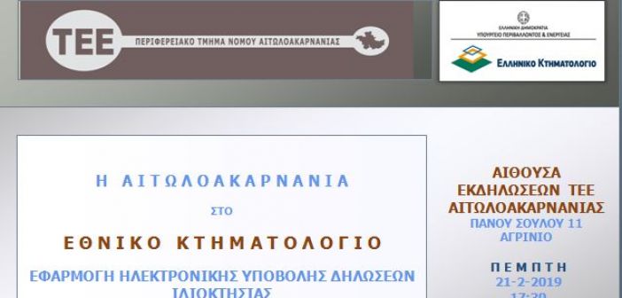 Εσπερίδα στο Τ.Ε.Ε. Αιτ/νίας με θέμα: «Εφαρμογή Ηλεκτρονικής Υποβολής Δηλώσεων Ιδιοκτησίας»