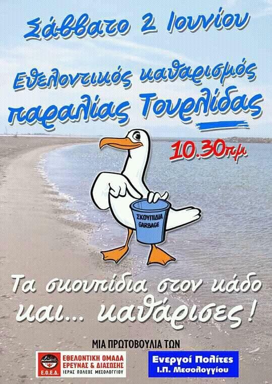 Σε εθελοντικό καθαρισμό της Τουρλίδας θα προχωρήσουν, η Εθελοντική Ομάδα Έρευνας και Διάσωσης Μεσολογγίου και οι Ενεργοί Πολίτες Μεσολογγίου, το Σάββατο 2 Ιουνίου.