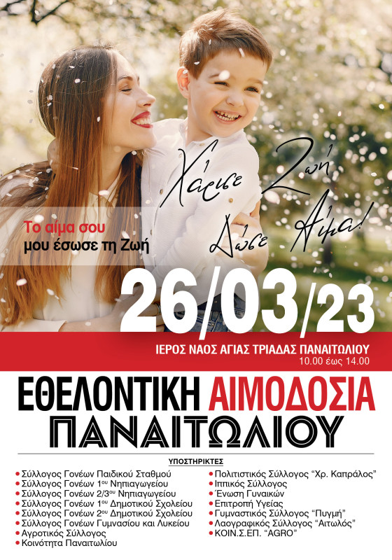 Η Εθελοντική Αιμοδοσία θα πραγματοποιηθεί, την Κυριακή, 26 Μαρτίου από τις 10:00 το πρωί μέχρι 2:00 το μεσημέρι στον Ιερό Ναό Αγίας Τριάδας Παναιτωλίου.