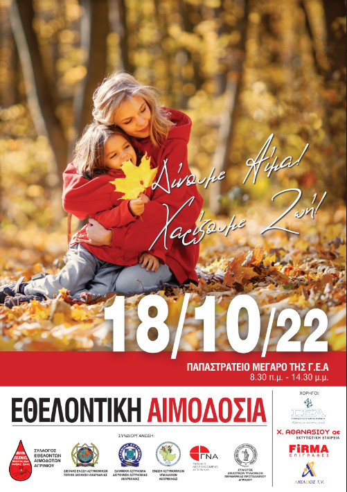 Την Τρίτη, 18 Οκτωβρίου 2022 στο Παπαστράτειο Μέγαρο της Γ.Ε.Α. στην Πλατεία Παναγοπούλου 4 στο Αγρίνιο από 8:30 π.μ. μέχρι 2:30 μ.μ. δίνουμε αίμα – χαρίζουμε ζωή.
