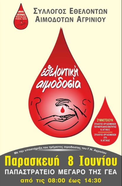 με την υποστήριξη της Υπηρεσίας Αιμοδοσίας της Νοσηλευτικής Μονάδας Αγρινίου, του Γενικού Νοσοκομείου Αιτ/νίας