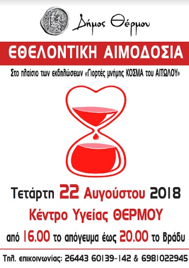 Η εν λόγω αιμοδοσία, η οποία διεξάγεται κατόπιν πρωτοβουλίας του Δήμου Θέρμου από το Τμήμα Αιμοδοσίας του Νοσοκομείου Αγρινίου, είχε αρχικά αποφασισθεί να γίνει για την ανακούφιση των πληγέντων από τις πρόσφατες φονικές πυρκαγιές στην Αττική και είχε μάλιστα εκδηλωθεί πολύ μεγάλο ενδιαφέρον για συμμετοχή μεγάλου αριθμού συμπολιτών μας σ’ αυτή. Ιδιαίτερα συγκινητικό μάλιστα είναι το γεγονός ότι μεγάλο μέρος των ατόμων που είχαν δηλώσει συμμετοχή είναι νέοι άνθρωποι, πράγμα που μας γεμίζει περηφάνια ως τοπική κοινωνία και αποτελεί ένεση αισιοδοξίας για το μέλλον.