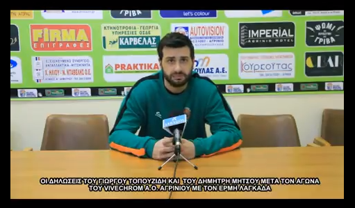 Οι δηλώσεις του παίκτη του Ερμή Λαγκαδά Γιώργου Τοπουζίδη και του αρχηγού του Α.Ο. Αγρινίου Δημήτρη Μήτσου μετά τον αγώνα μεταξύ των δύο ομάδων.