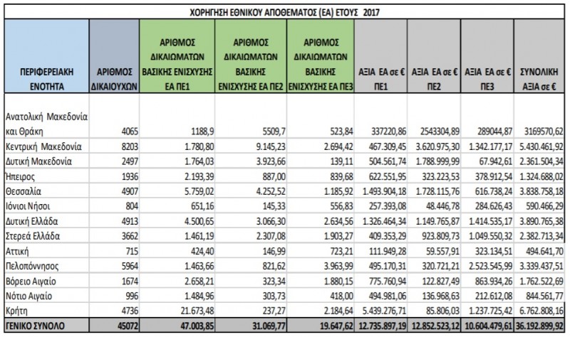 Στους πίνακες χορήγησης Εθνικού Αποθέματος (ΕΑ) των ετών 2017, 2018, 2019, 2020 αποτυπώνονται ανά περιφερειακή ενότητα, ο αριθμός των δικαιούχων, ο αριθμός δικαιωμάτων, οι συνολικές αξίες (σε €) των χορηγηθέντων δικαιωμάτων και της προσαύξησης της μοναδιαίας αξίας τους στον Περιφερειακό Μέσο Όρο του εθνικού αποθέματος, ανά περιφέρεια (ΠΕ1: Βοσκοτόπων, ΠΕ2: Αρόσιμων εκτάσεων και ΠΕ3: Μονίμων καλλιεργειών).