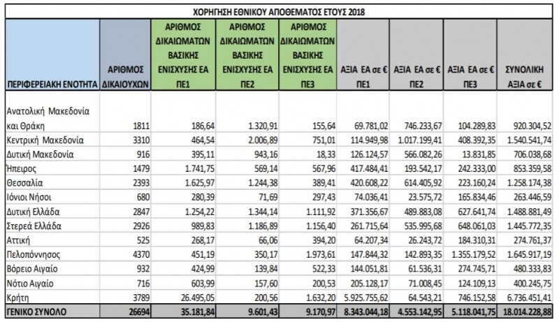 Στο εν λόγω ποσό συμπεριλαμβάνονται 44.998.482,57 € που αφορούν σε χορήγηση δικαιωμάτων Εθνικού Αποθέματος. Επίσης πιστώθηκε για την χορήγηση Πράσινης Ενίσχυσης ποσό ύψους 491.360.878,74 € (ποσοστό πληρωμής 95%) και η ενίσχυση για τους Γεωργούς Νεαρής Ηλικίας ύψους 30.151.139,32 € (ποσοστό πληρωμής 90%).
