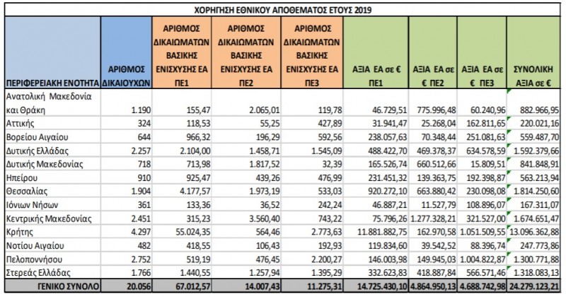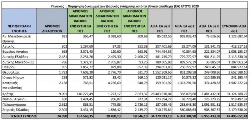 Β. Η συνολική αξία χορήγησης δικαιωμάτων εθνικού αποθέματος 2020 ανέρχεται σε 47.496.651,41 ευρώ εκ των οποίων 44.948.482,57 € είχαν δοθεί τον Δεκέμβριο 2020 και 2.498.168,84 ευρώ με την εκκαθάριση τον Ιούνιο του 2021. Αναλυτικά μετά την νεότερη επεξεργασία προσδιορισμού τόσο των τελικά δικαιούχων όσο και της προσδιορισθείσας έκτασης προέκυψαν: